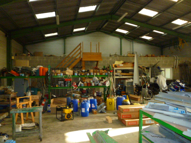 Structure du bâtiment : charpente métallique ; parois isolation double peau ; toiture fibro sans amiante ; dalle béton ; 2 portails sectionnels coulissants ; hauteur de faitage de 6 m